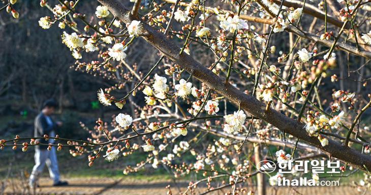 [한라일보] 포근한 날씨를 보인 18일 제주시 신산공원에 매화꽃이 만개해 눈길을 끌고 있다. 강희만기자
