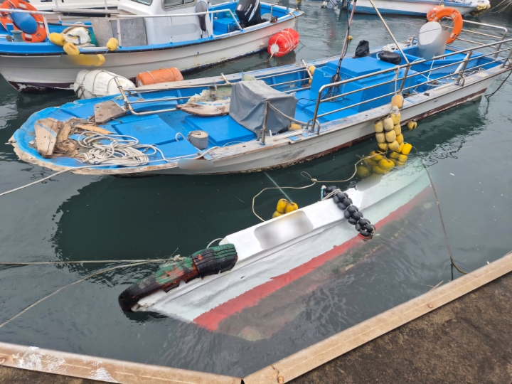 제주 해역에 풍랑주의보가 내려진 21일 오후 제주시 용담포구 내에서 레저보트(0.77t) 1척이 침수된 채 발견됐다. 제주해양경찰서 제공