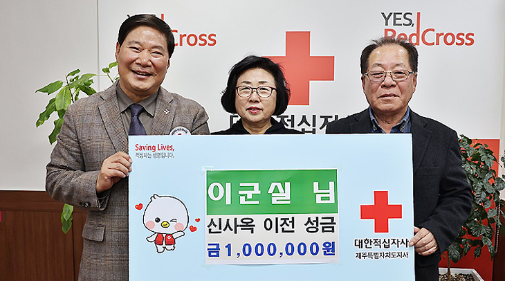 이군실 씨는 21일 대한적십자사 제주특별자치도지사(회장 정태근)를 방문해 신사옥 이전 성금 100만원을 기탁했다.