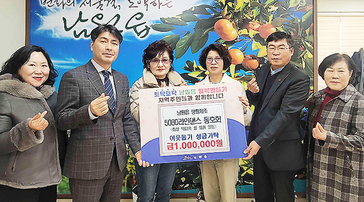 서귀포시 남원읍 생활체조 5060라인댄스 동호회(회장 박미숙)는 지난 20일 지역 내 어려운 이웃을 돕는데 사용해 달라며 남원읍에 성금 100만원을 기탁했다.