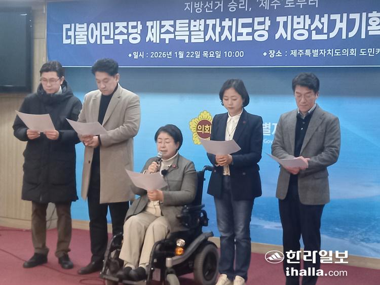더불어민주당 제주특별자치도당 지방선거기획단이 22일 제주도의회 도민카페에서 기자회견을 가졌다. 오소범 기자
