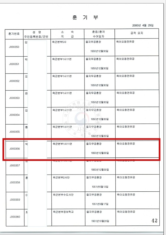 또 훈기부에 기재된 소속 ‘육군본부1사11연’은 박 대령의 마지막 소속과 직급인 ‘조선국방경비대(현 육군) 제11연대장’과 일치한다. 이같은 내용으로 미루어보아 훈기번호 ‘J000356’은 박 대령임을 추정할 수 있다.