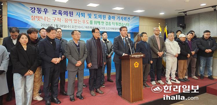 강동우 교육의원이 28일 도민카페에서 기자회견을 열고 도의원 출마를 공식 선언했다. 장태봉 기자