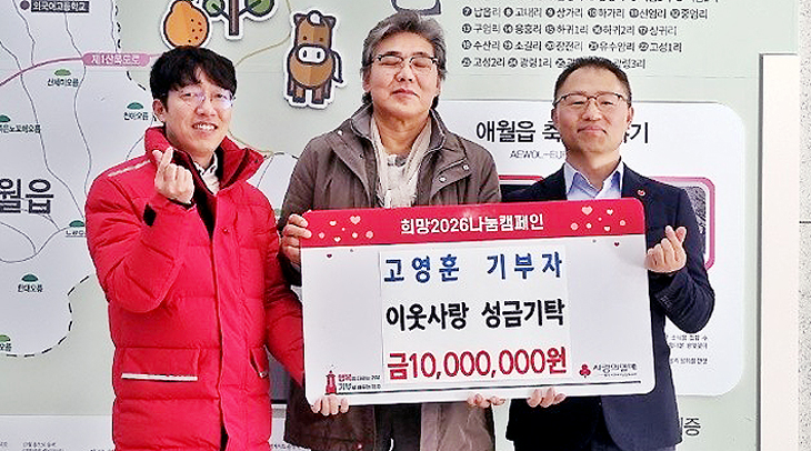 고영훈 씨는 지난달 28일 제주시 애월읍사무소(읍장 김태헌)를 찾아 애월읍 이웃사랑 성금 1000만원을 기탁했다. 성금은 관내 취약계층에 지원될 예정이다.