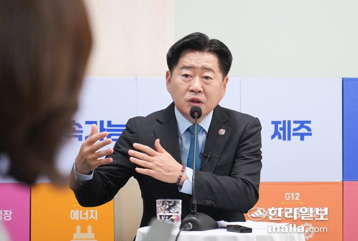오영훈 제주도지사가 4일 제주도청에서 열린 출입기자단과의 간담회에서 발언하고 있다. 제주자치도 제공