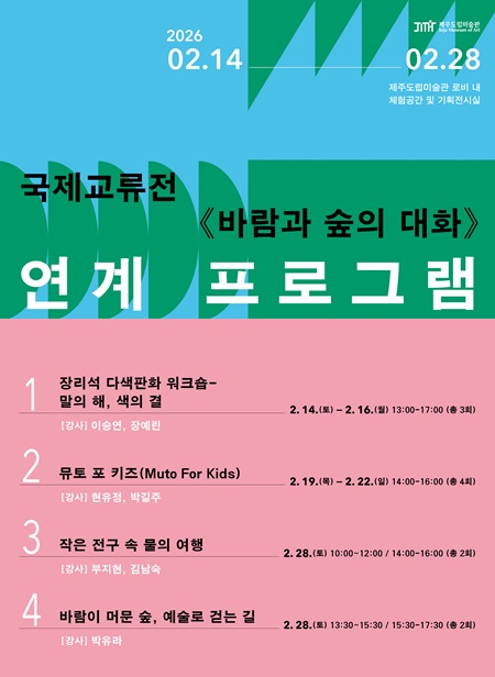 프로그램은 전시된 작품에 대한 소재와 기법을 쉽게 이해할 수 있도록 네 가지로 구성됐다. '장리석 다색판화 워크숍: 말의 해, 색의 결'(14~16일), '뮤토 포 키즈(Muto For Kids)'(19~22일)', '작은 전구 속 물의 여행'(28일), '바람이 머문 숲, 예술로 걷는 길'(28일) 등이다.
