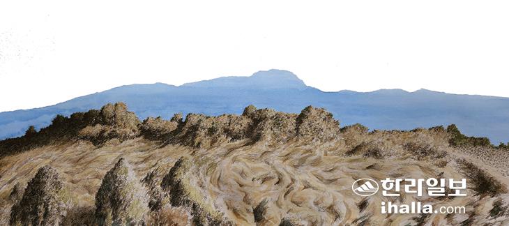 항우가 떠오르는 언덕동산이다. 스스로의 능력을 표현함에 있어 '산을 뽑고 세상을 덮는다'고 했으니, 뽑으면 뭐하나? 저렇게 산을 들어 올려야지! 기울어진 태양이 측면 광선을 제공하고 옹골찬 기운을 가진 저 동산의 용력은 흐름 자체로 한라산을 번쩍 들었다. 악보의 형상으로 판단해도 높은음 자리 흐름을 낮은음 자리 악보가 들어 올리는 형국이다. 어찌하여 이 경관을 보자마자 무릎을 치며 탄성을 지르게 됐는가? 내가 봤으면 옛 이름 엄장리를 설촌한 조상들도 봤을 것이다. 산이라도 들어 올릴 항우의 기백이 느껴지는 여기다. 동산의 능선은 사실적인 표현을 했지만 하단으로 갈수록 표현주의적 요소를 감행해 들어올리기 위한 기운생동의 이미지를 강조했다. 너무도 단순한 두 개의 흐름 속에서 끊임없이 새로운 변화를 모색하고 목적을 향해 돌진하는 메시지려니. 한라산과 하늘이 만나는 멜로디와 저 동산의 윗선 흐름은 너무도 화음이 잘 맞아떨어진다. 닮은 듯 다른 변화들이 서로 주고받으며 연주하는 재즈 음악을 연상시키는 놀라운 선율. 이 마을에서 태어나 평생을 살다 간 숱한 사람들이 구체적인 생각에 접근하지 못했다 하더라도 이 풍경이 주는 한라산과의 교감을 경이로운 눈으로 바라봤을 것이라는 황당한 추론 속에서 그려나갔다. 다시 한라산을 들어 올릴 방법을 찾으라면 신엄리에 가서 확인하라고 할 것이다. 관점의 차이가 시점의 차이를 부른다는 언표를 존중하게 한다. 땅이 보유한 기백이 마을 공동체에 가득하여라.