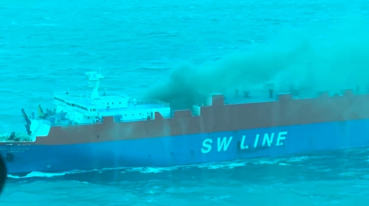 6일 오후 5시 34분쯤 제주항 북쪽 약 17km 해상에서 화물선 A호(9952t) 내 화물차에서 화재가 발생했다. 제주해경 제공