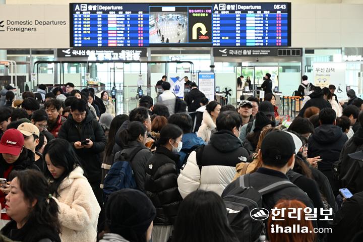 8일 제주공항에 많은 눈이 내리면서 제설작업으로 공항이 폐쇄되자 출발대합실이 크게 붐비고 있다. 강희만 기자