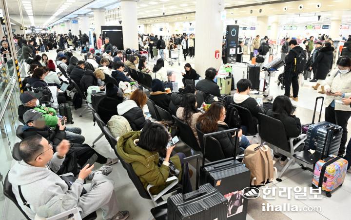 청주공항으로 향하는 항공편이 결항됐다는 조모(50대)씨는 “가장 빠른 항공편으로 변경해준다고 해서 내일 모레(화) 오후 4시 항공편을 예약했다”며 “어쩔 수 없이 회사에 휴가를 2일 더 내고, 지낼 숙소를 찾고 있다”고 말했다.