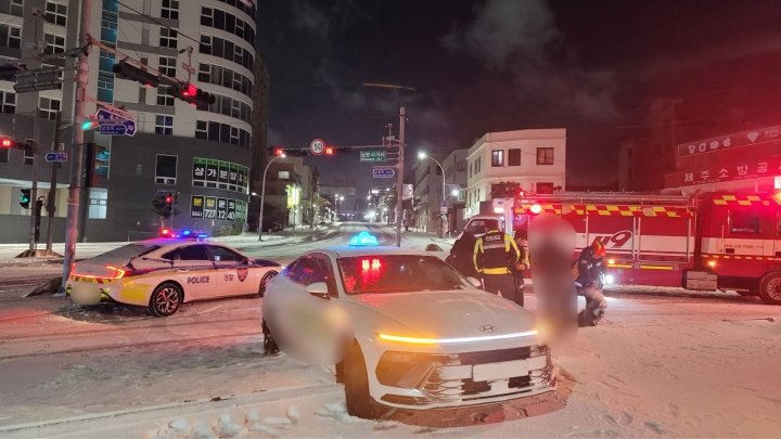 8일 새벽 제주시 삼도2동에서 택시가 눈길에 미끄러지는 사고가 발생했다. 제주소방안전본부 제공