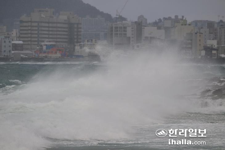 제주 전 해상에 풍랑특보가 발효된 8일 제주시 해안가에 강한 파도가 몰아치고 있다. 강희만기자