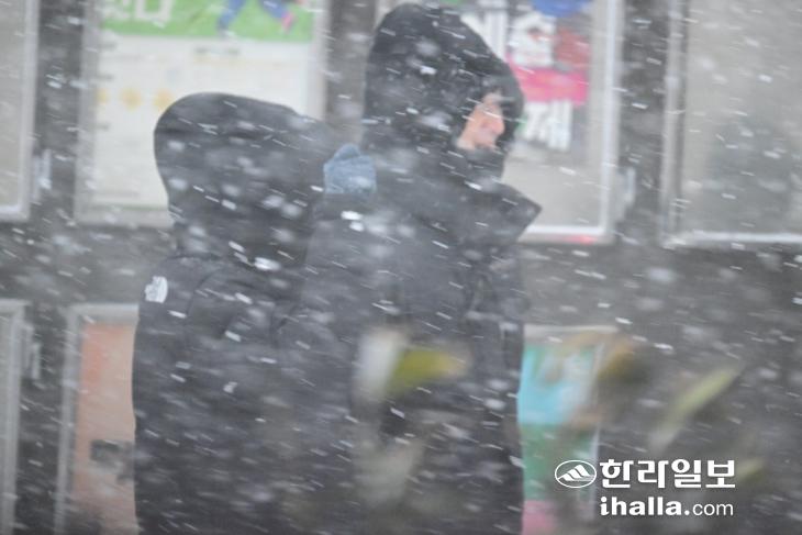 제주에 많은 눈과 강한 바람이 불어닥친 8일 제주시 연동에서 시민들이 쏟아지는 눈을 맞으며 걷고 있다. 강희만기자
