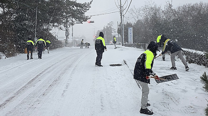 제주소방서 오라의용소방대(대장 이창열·김선금)는 8일 대설과 한파 속에서 간선 도로와 결빙 취약 구간에 대한 제설작업 및 소방용수 점검을 실시했다.