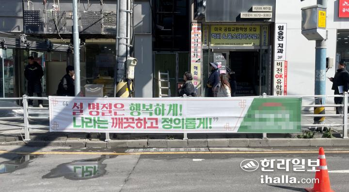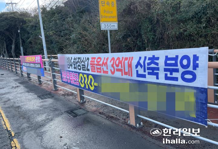 9일 오전 제주시 이호동의 한 횡단보도 인근에 불법 현수막이 게시돼 있다. 양유리기자