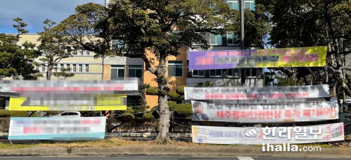 9일 오전 제주시 연동의 한 도로. 가로수 사이로 현수막들이 마구 설치돼 있다. 양유리기자