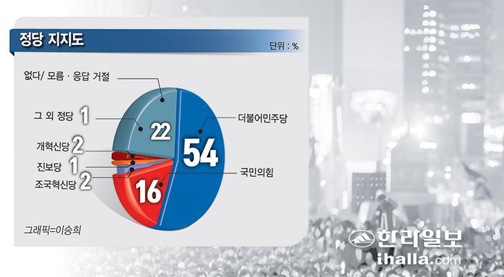 ▶지지 정당 민주당 강세 뚜렷= 정당 지지도 조사에서는 민주당 강세 현상이 뚜렸했다. 어느 정당을 지지하는 지 물은 결과 민주당 지지율은 절반을 넘는 54%로 경쟁 정당을 여유있게 앞선 것으로 조사됐다. 이어 ▷국민의힘 16% ▷조국혁신당·개혁신당 각각 2% ▷진보당 1% ▷그외 정당 1% 등의 순이었다. 나머지 19%는 지지하는 정당이 없다거나, 모름 또는 답변을 거부했다.