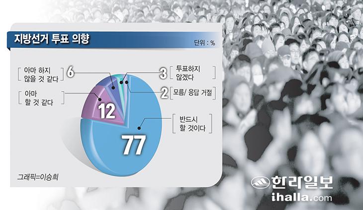 한편 다가오는 6월3일지방선거에서 "반드시 투표하겠다" 또는 "투표할 것 같다"고 밝힌 응답자는 전체의 89%로 조사됐으며 9%는 "투표하지 않겠다"거나, "투표하지 않을 것 같다"고 답했다. 나머지 2%는 답변을 거절하거나 모른다고 했다.