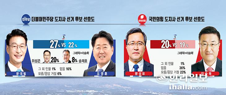 또 민주당 지지층에선 ▷문대림 33% ▷오영훈 22% ▷위성곤 21% ▷송재호 5% 순으로 선호도를 보였고, 국민의힘 지지층에선 ▷김승욱·오영훈 각각 22% ▷문성유·문대림 각각 8% ▷위성곤 5% 등의 순으로 나타났다.