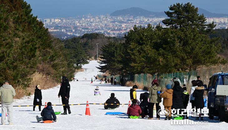 [한라일보] 9일 제주시 오라동 오라관광단지 개발사업 부지 진입로에서 시민과 관광객들이 눈썰매를 타고 있다. 강희만기자