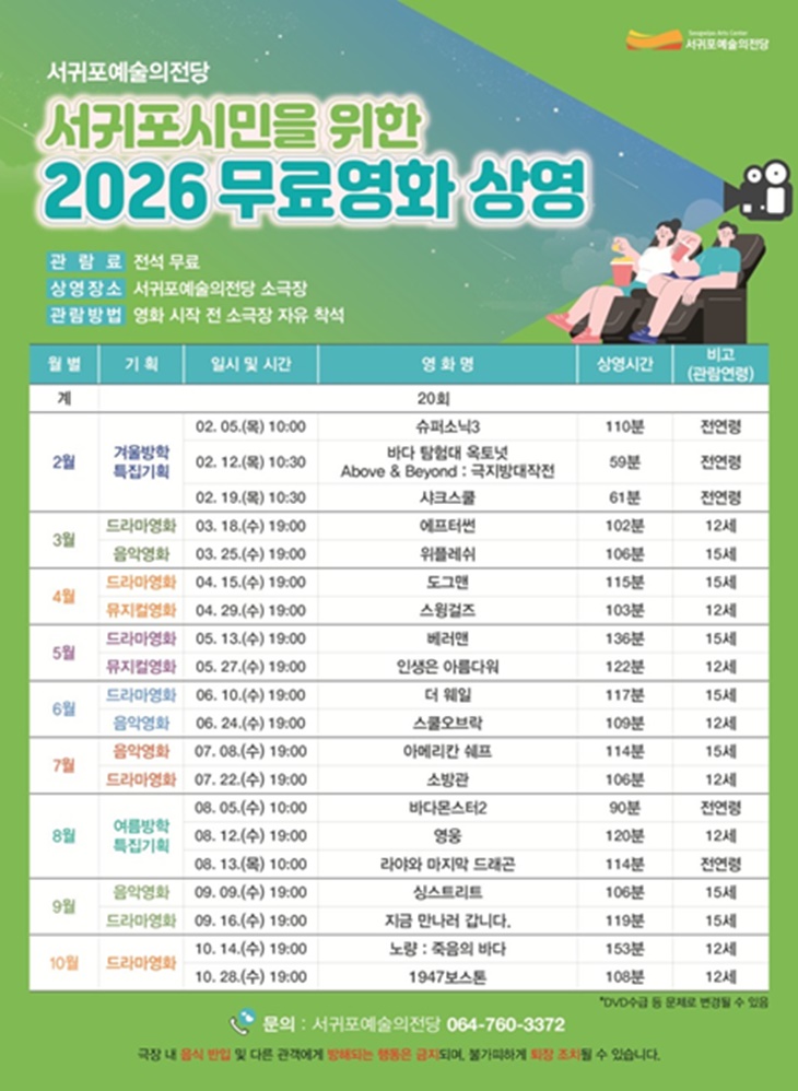 서귀포예술의전당 "올해 영화 20편 무료 상영"