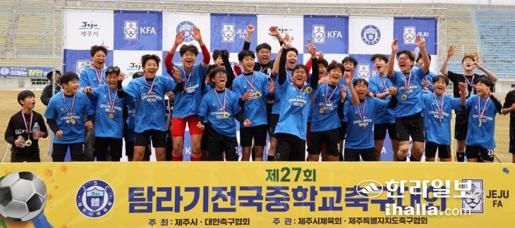 지난 10일 탐라기전국중학교축구대회 탐라기 부문 결승전에서 우승을 차지한 경기평택유나이티드U15 선수단이 환호하며 승리의 기쁨을 나누고 있다. 제주시체육회 제공