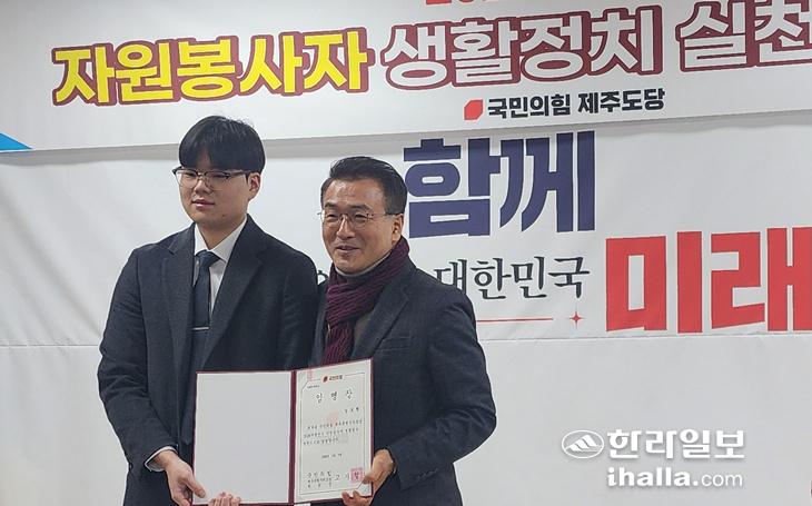 고기철 국민의힘 제주도당 위원장이 생활정치실천단 출범식에서 임명장을 수여하고 있다.국민의힘 제주도당 제공