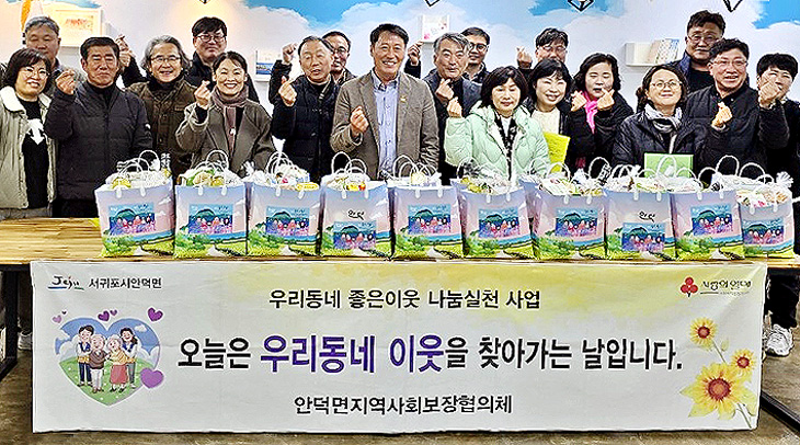 서귀포시 안덕면지역사회보장협의체(공동위원장 김태유·양성윤)는 지난 10일 협의체 위원 20여 명이 참여한 가운데 2월 '우리 동네 좋은 이웃 나눔 실천' 사업을 추진했다. 이 사업은 협의체 위원들이 취약가구와 1대1 결연해 정기적으로 가정을 방문, 복지 사항을 확인하고 지원하는 사업이다.