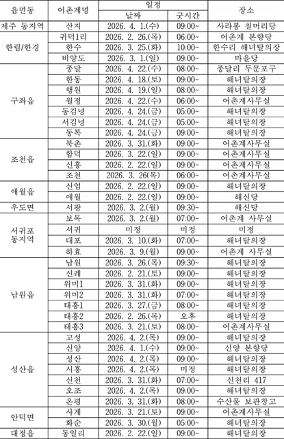 2026년 제주 해녀굿 일정. 서귀, 표선어촌계 해녀굿 날짜는 미정이다. 제주도 제공