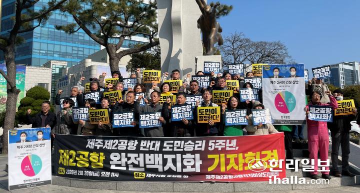 제주제2공항강행저지비상도민회의는 20일 오전 제주시청 앞에서 ‘제2공항 도민 승리 5주년, 제2공항 완전 백지화 투쟁 선포 기자회견’을 열었다. 양유리기자
