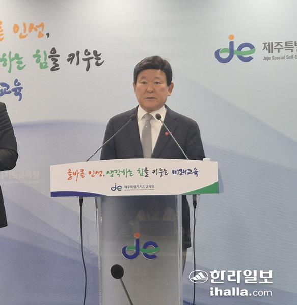 김광수 제주도교육감이 25일 도교육청 기자실에서 열린 기자회견에서 기자들의 질의에 답변을 하고 있다. 김채현 기자