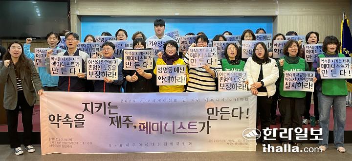 25일 오전 열린 ‘2026 3·8세계여성의날 기념 제주지역 여성대회’ 선포 기자회견. 양유리기자