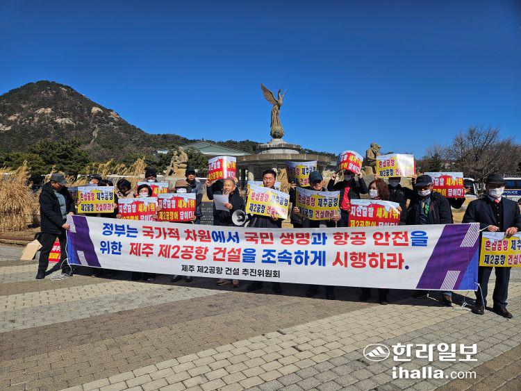 제주 제2공항 건설추진위원회는 25일 청와대 앞 분수대에서 기자회견을 갖고 "제주 제2공항은 국가 항공 안전과 제주 미래발전을 위한 국가 필수인프라 사업"이라며 조속히 착공에 나설 것을 촉구했다. 부미현 기자
