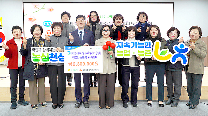 (사)농가주부모임제주특별자치도연합회(회장 고동심)는 지난 25일 농협제주본부에서 정기총회 및 회장 이·취임식을 개최하고, 행복나눔 성금 200만원을 제주사회복지공동모금회(회장 강지언)에 기탁했다.