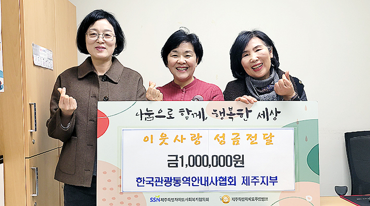한국관광통역안내사협회 제주지부(지부장 양인실)는 4일 제주특별자치도사회복지협의회(회장 고관용)에 자선바자회 수익금 100만원을 기탁했다.