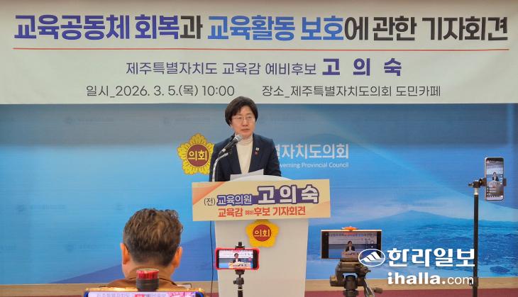 제주도교육감 선거에 출마한 고의숙 예비후보가 5일 제주도의회 도민카페에서 기자회견을 열고 있다. 김지은기자