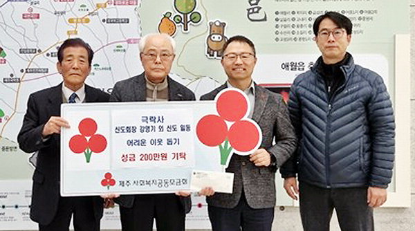[한라일보] 제주시 애월읍 소재 한국불교태고종 극락사(신도회장 강영기)는 지난 3일 애월읍사무소(읍장 김태헌)를 방문해 신도들이 모은 이웃돕기 성금 200만원을 기탁했다.