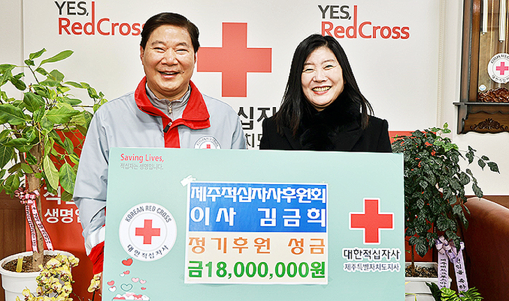 (주)유니이앤티 김금희 대표는 최근 대한적십자사 제주특별자치도지사(회장 정태근)를 방문해 정기후원 성금 1800만원 전달식을 가졌다.