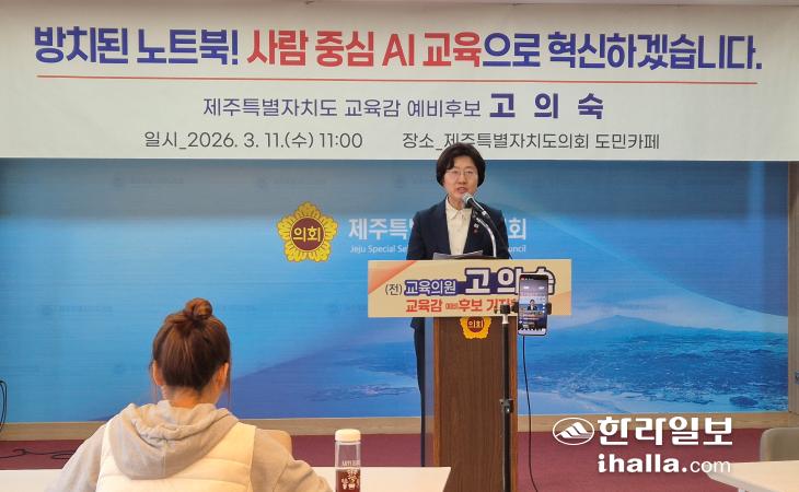 고의숙 예비후보는 11일 제주도의회 도민카페에서 기자회견을 열고 "미래 인재를 키우고 AI 미래교육을 지원하겠다"며 이같이 밝혔다. 제주도교육청 직속기관인 '제주융합과학연구원'을 'AI미래교육원'으로 확대 개편해 디지털·AI미래교육 지원의 산실로 구축하겠다는 구상이다.