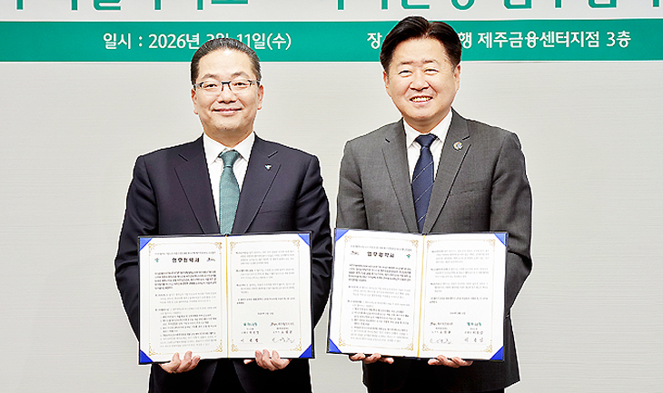 제주도는 11일 제주시 중앙로 하나은행 제주금융센터지점에서 오영훈 제주도지사와 이호성 하나은행장 등이 참석한 가운데 '민·관 협력형 기업 유치 거점 조성을 위한 제주도-하나은행 공동협력 업무협약'을 체결했다.