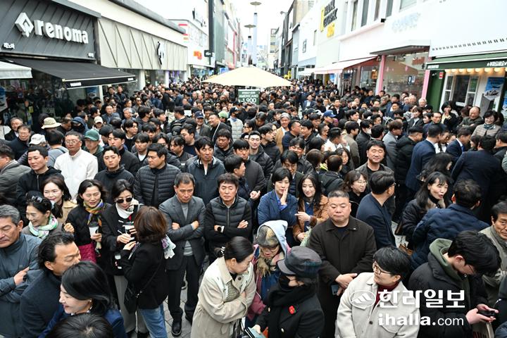 오영훈 제주도지사의 재선 도전 기자회견이 열린 제주시 칠성로 일대에 지지자와 시민들이 몰리며 거리가 인파로 가득 차 있다. 강희만기자