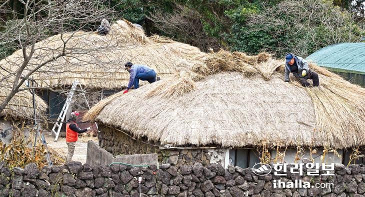 국가민속문화유산으로 지정된 '제주 성읍마을'에서 초가지붕 잇기 작업을 하고 있다. 한라일보 DB