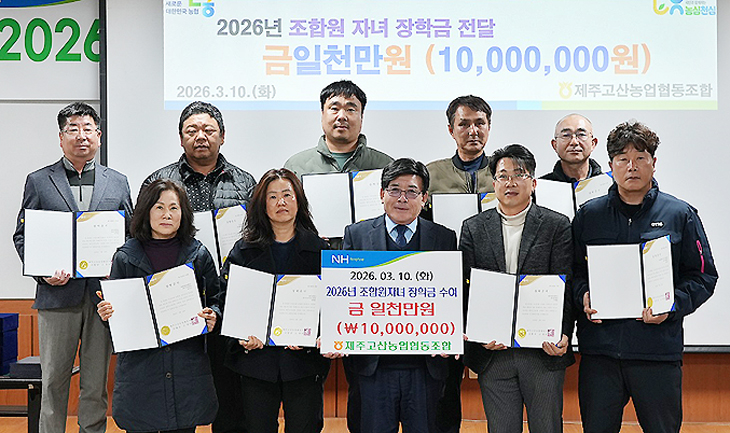 제주고산농협(조합장 고영찬)은 지난 10일 농협 유통센터에서 조합원 자녀 14명에 총 1000만원의 장학금을 전달했다.