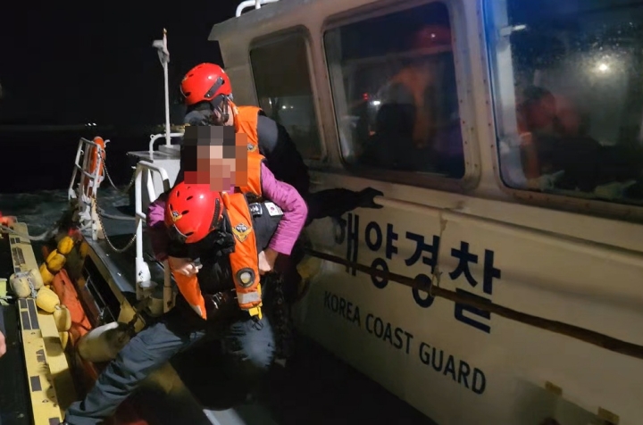 지난 15일 밤 우도 주민 80대 A씨가 해양경찰에 의해 긴급 이송되고 있다. 서귀포해양경찰서 제공