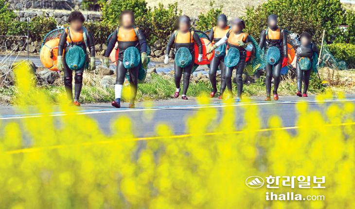 활짝 핀 유채꽃 사이로 물질하러 가는 제주 해녀. 한라일보DB
