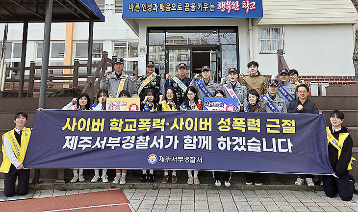 제주서부경찰서(서장 김준식)는 17일 제주시 애월읍 하귀2리 귀일중학교에서 합동 등굣길 캠페인을 전개했다.