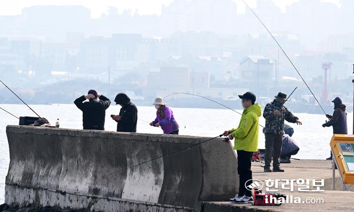 [한라일보] 17일 제주시 애월읍 하귀리 가문동포구를 찾은 사람들이 봄날씨 속에서 낚시를 즐기고 있다. 강희만기자