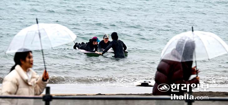 [한라일보] 18일 제주시 이호해수욕장에서 초보자들이 비가 내리는 가운데 서핑을 배우고 있다. 강희만기자