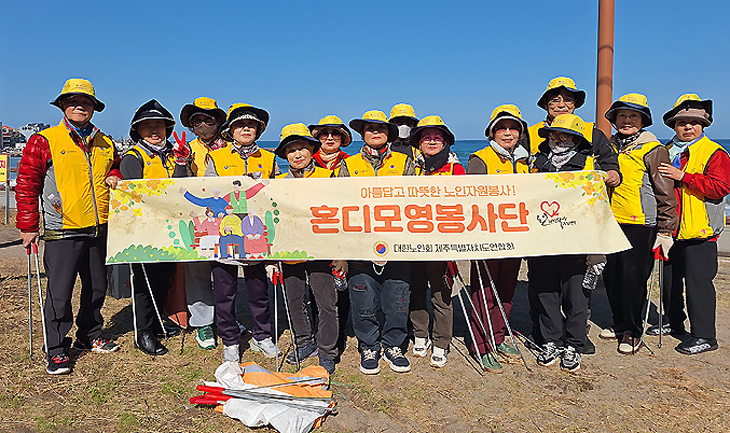'아름답고 따뜻한 노인 자원봉사'를 내건 대한노인회 제주도연합회 혼디모영봉사단(단장 김한종)은 19일 제주시 이호해수욕장에서 바다 환경 정화 활동을 실시했다.