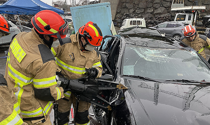 제주동부소방서(서장 강성부)는 지난 17~18일 제주시 조천읍 소재 폐차장에서 현장대원 교통사고 대응 역량강화 훈련을 실시했다.